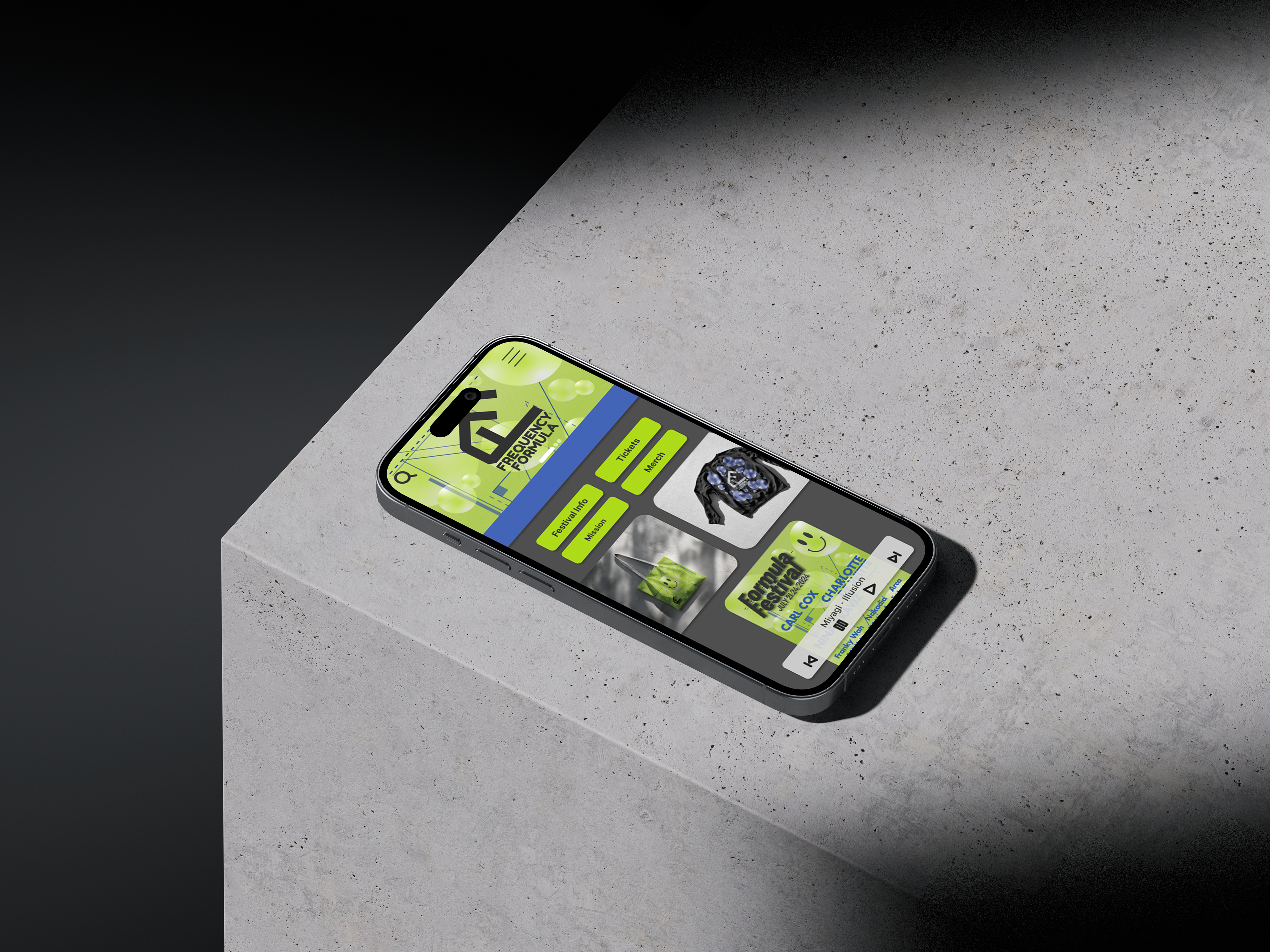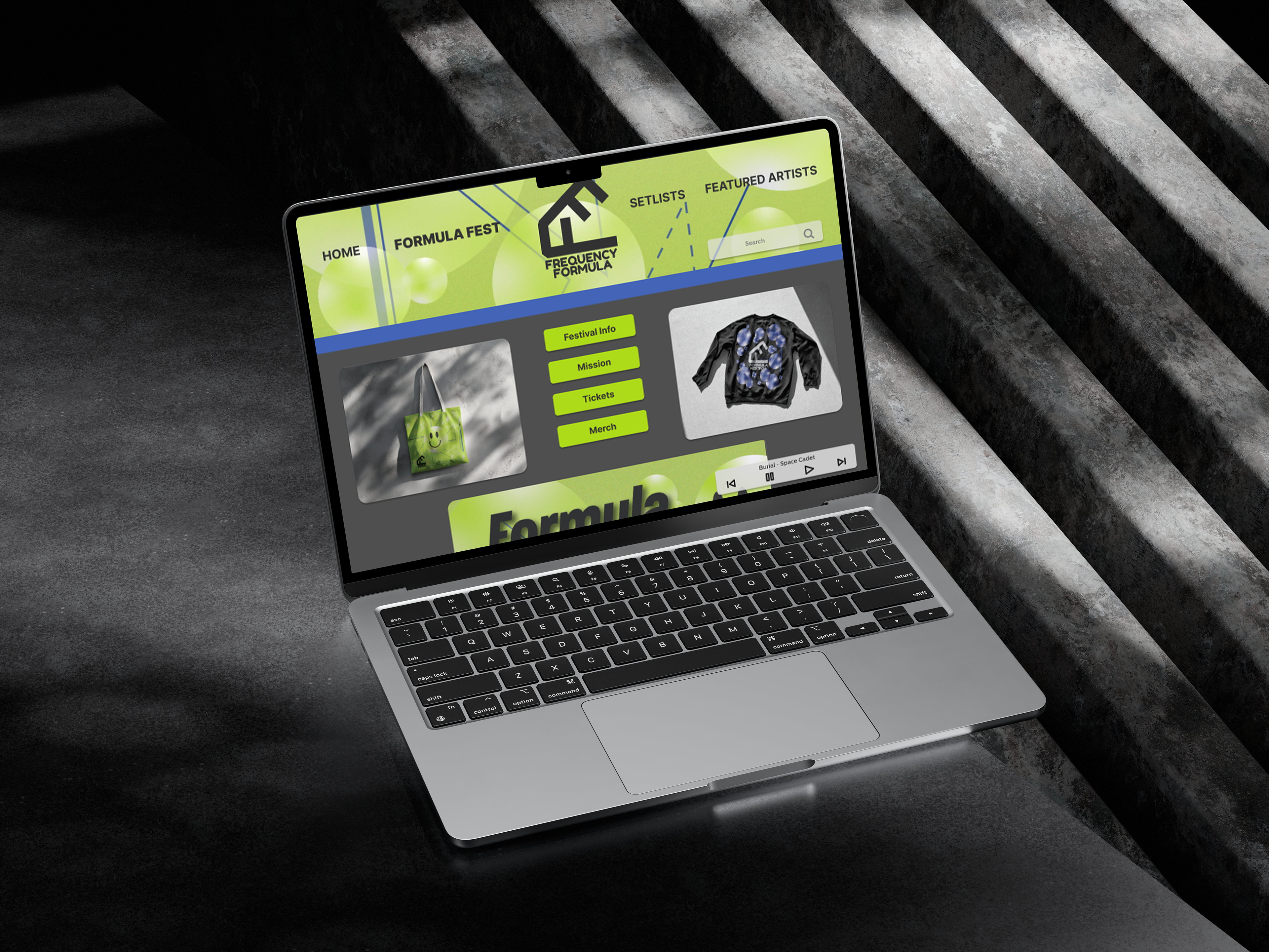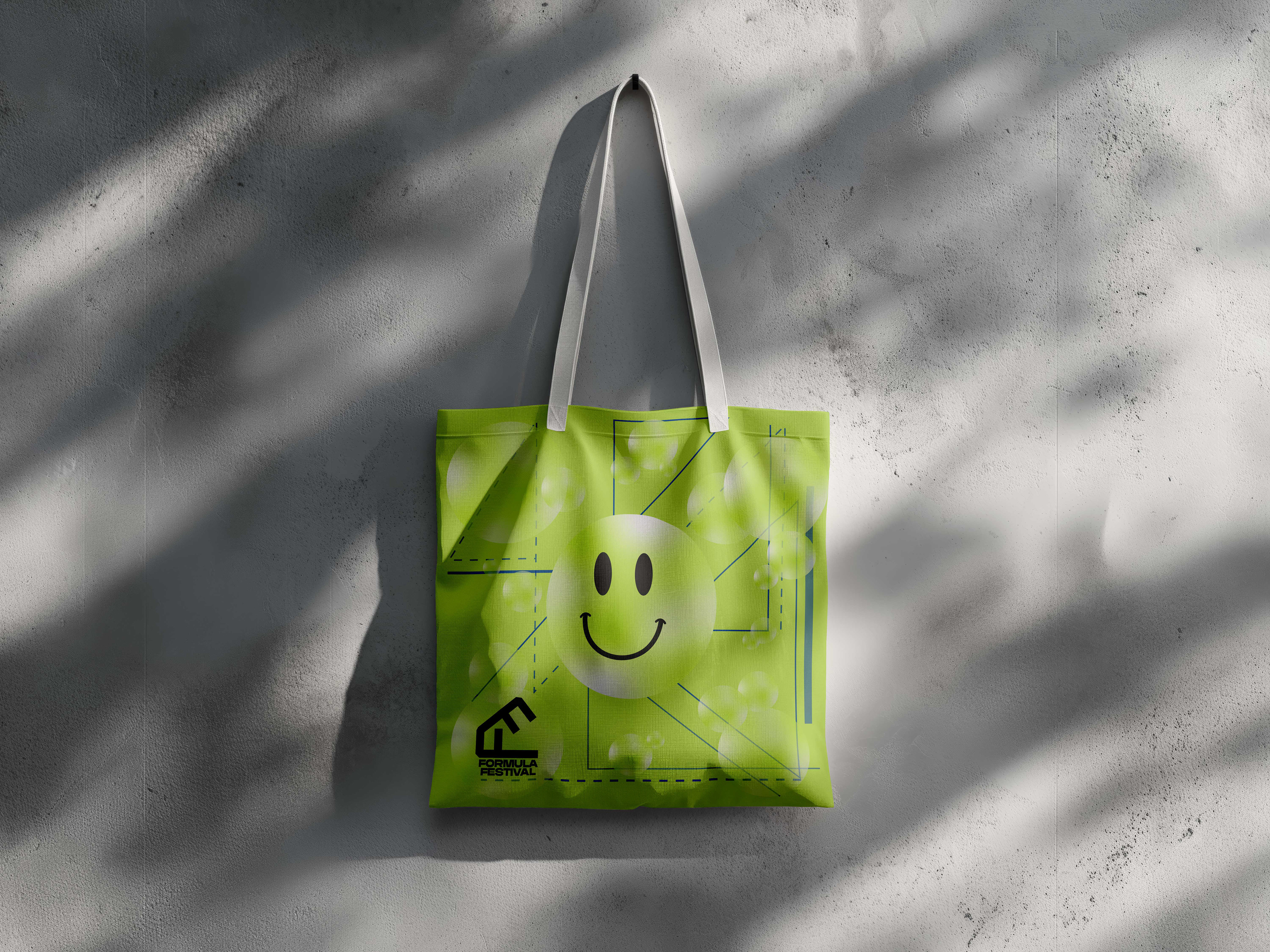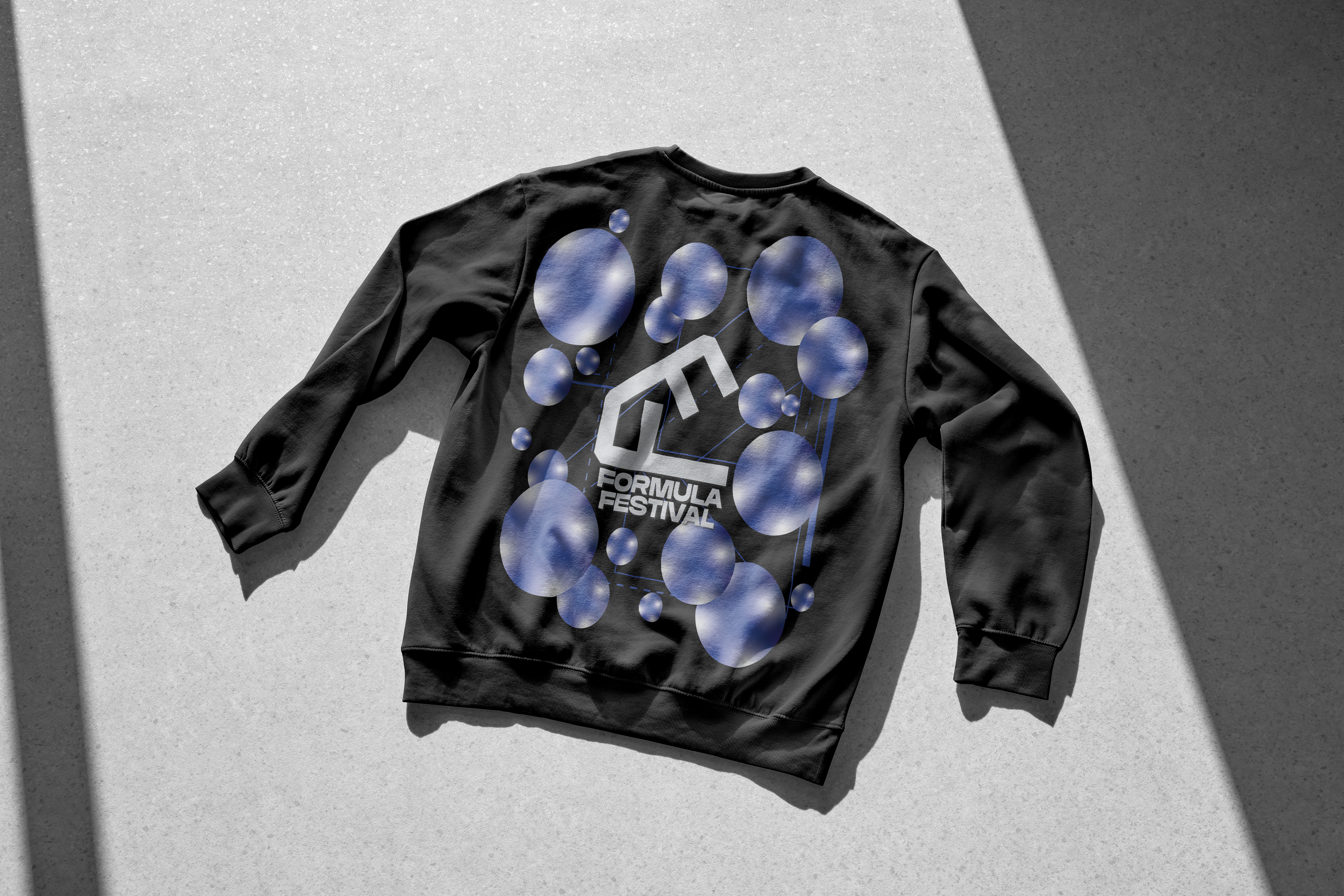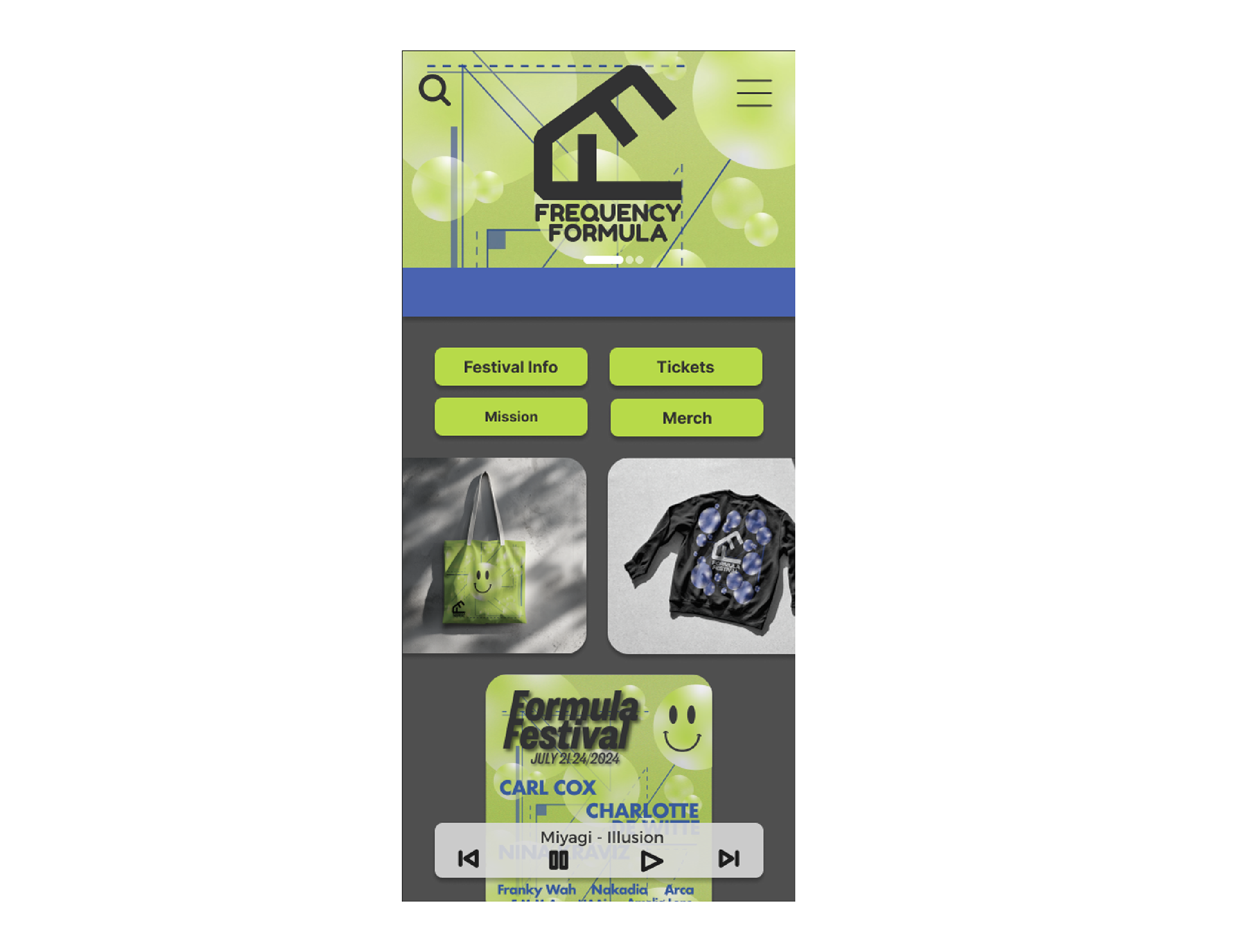 One of the main components of this project is the festival poster. After studying posters of other festivals and genre events, I settled on a geometric pattern, representing lasers that often appear at these events. The name of the festival, Formula, also offers a mathematical interpretation. The visual geometry seen in the poster plays with the music’s actual mathematical formula, being a steady and repetitive beat. Since house and techno music derive from disco, there is a lot of use of spherical shapes, used to represent disco balls. I chose to use bubbles to maintain an unseriousness in the theme and continued that motif throughout the other assets.