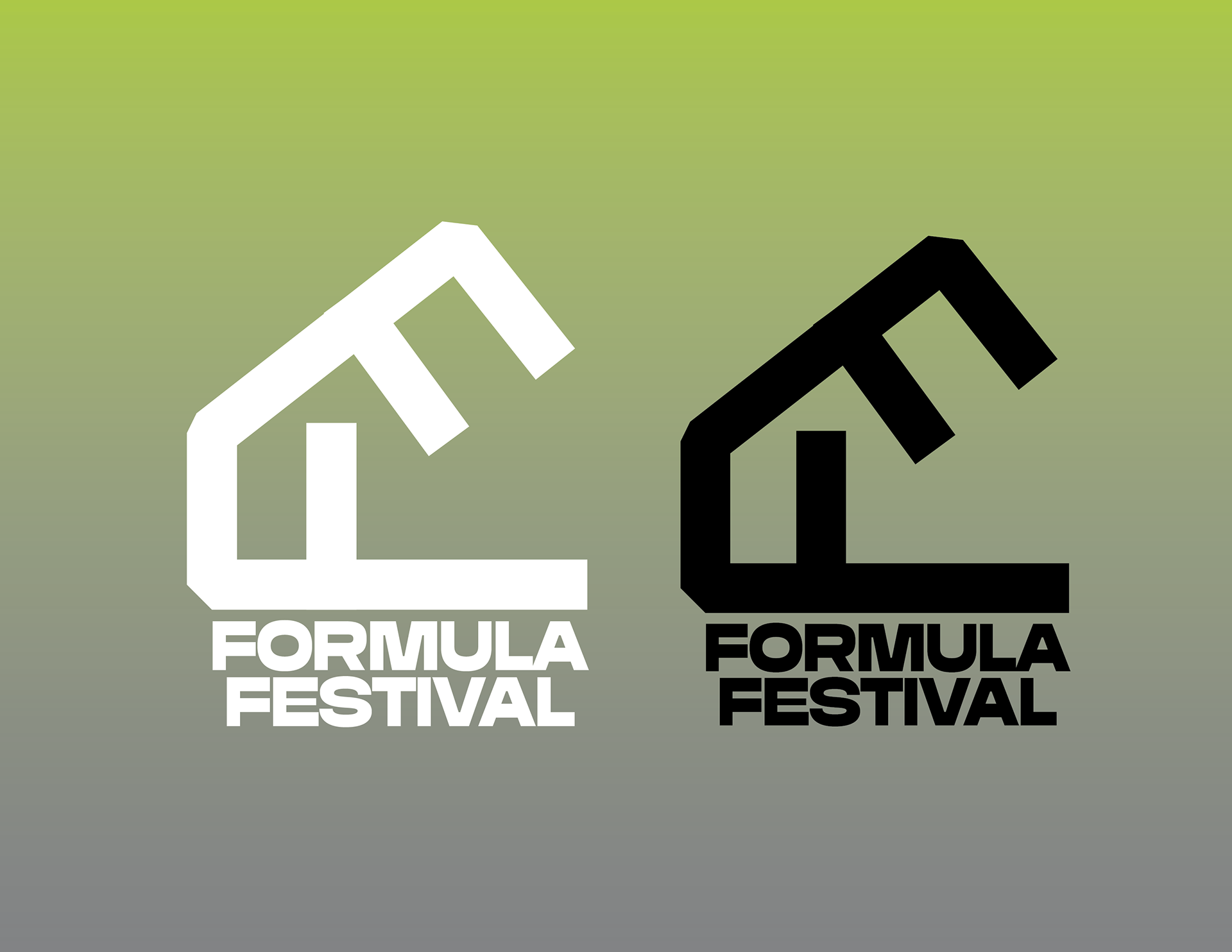 The Formula Festival logo was created by forming two letter F’s into a pitched roof “house” shape. Members of the subculture often refer to these events as going church and the logo’s overall shape teases with this reference. The arms of the Fs represent a DJ booth and lasers coming from the ceiling. I wanted to keep it mathematical and follow the golden ratio, which, without the festival text, it does. The logo can work in black and white or in any of the festival colours.