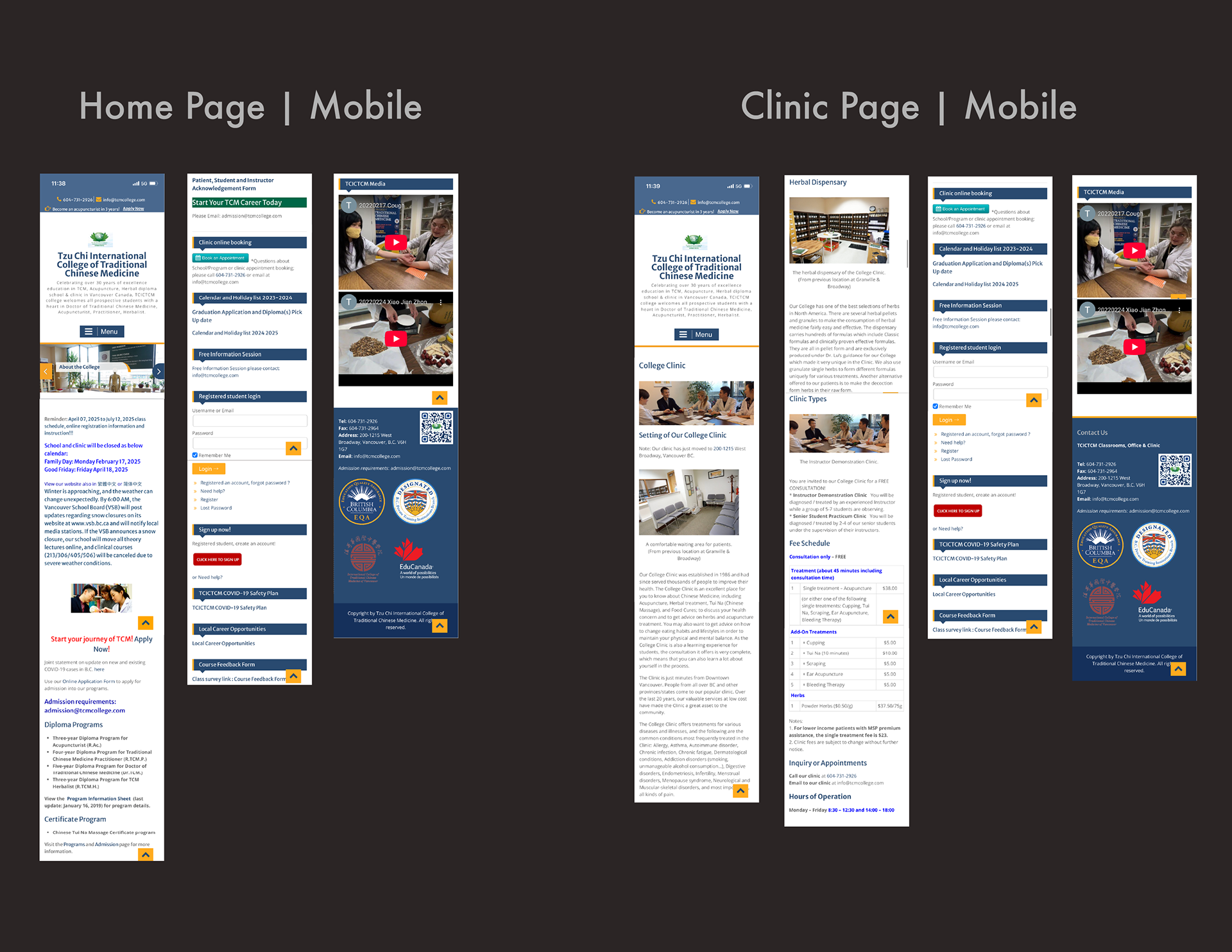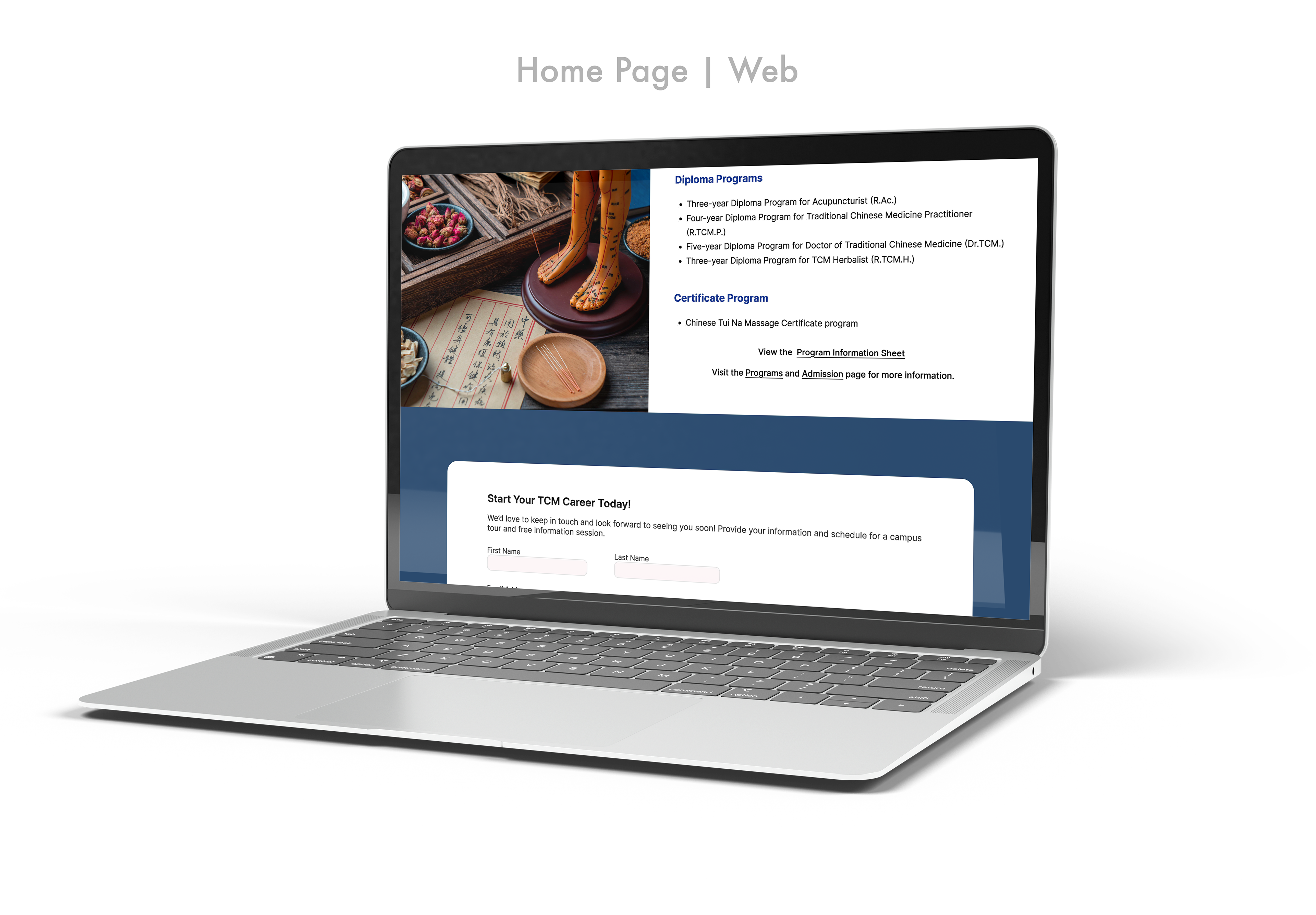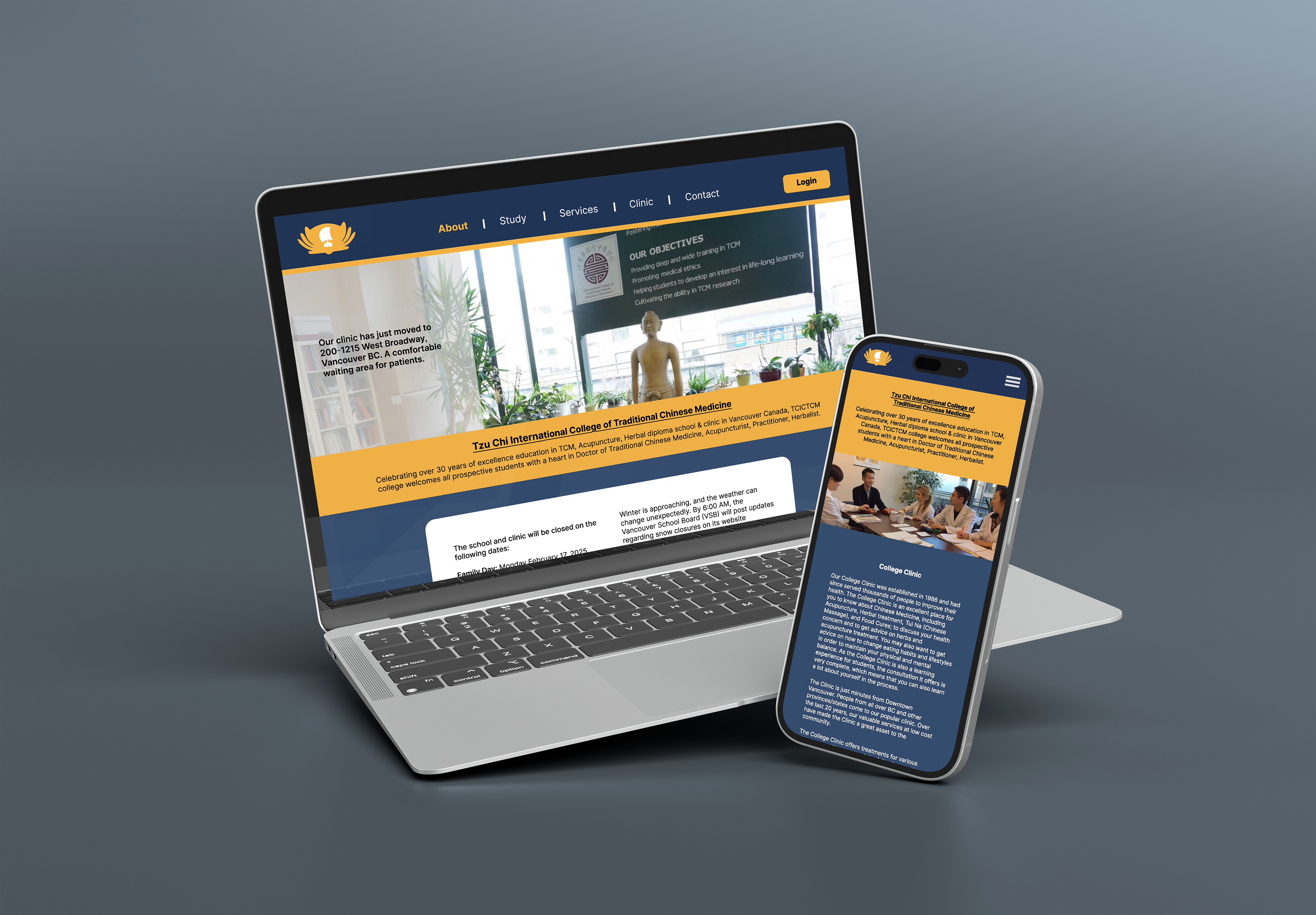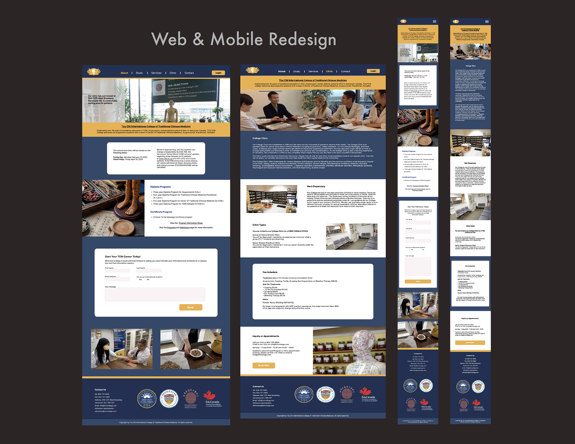 The Tzu Chi International College of Traditional Chinese Medicine design study takes a modern avenue to this Vancouver, Canada-based institution. I worked on this web redesign to explore a contemporary web approach within an existing brand's constraints and demonstrate my ability to take the content and redesign it for more optimal navigation and user experience. This project reflects a responsive redesign for mobile and web platforms and was completed using Figma and Adobe Illustrator.