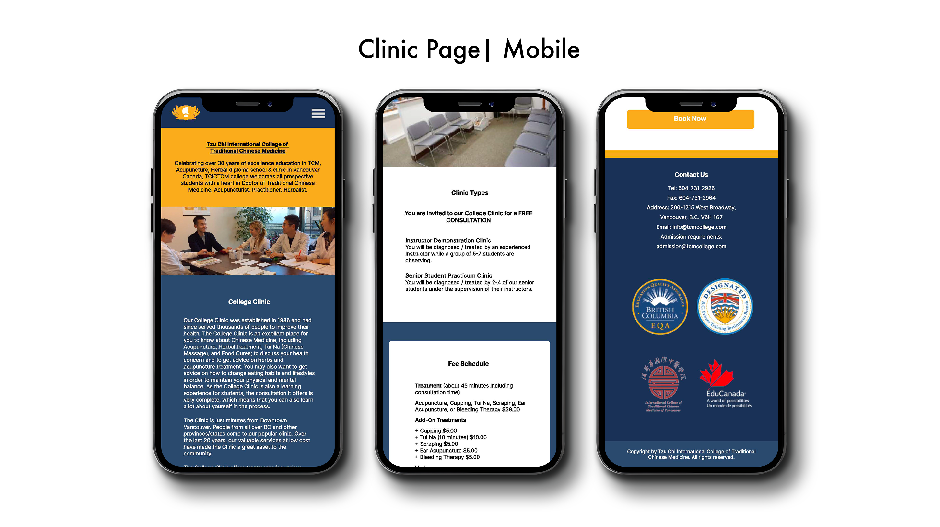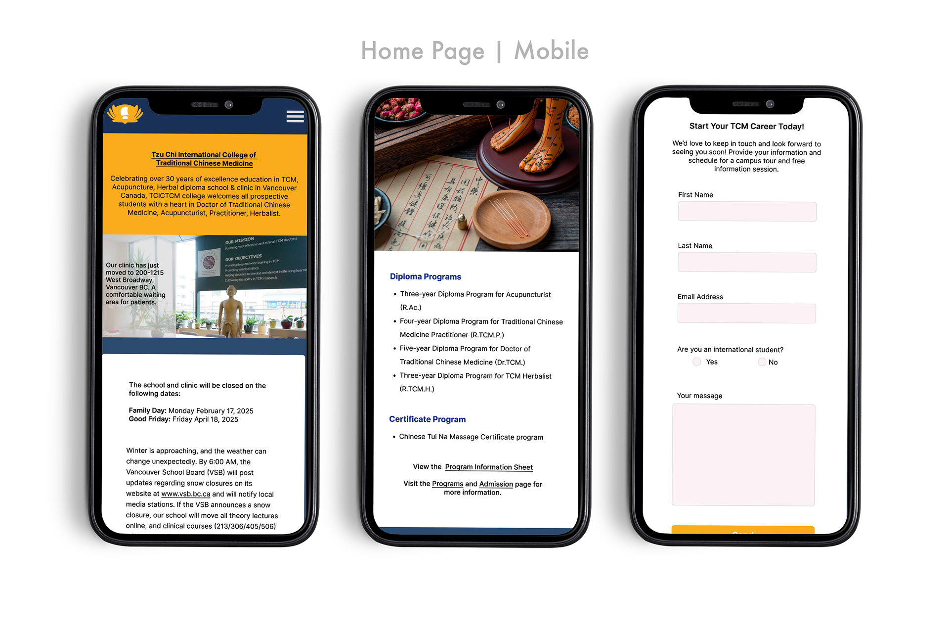 The images on the original website were of low quality, but I did not want to switch them out. I made them smaller and used them in some of the section cards. One image was of such low quality that I replaced it with a stock image of something similar in content and tone. Another challenge I found was in the name of the organization itself. The full name is "Tzu Chi International College of Traditional Chinese Medicine," and its acronym is TCICTCM. The length and complexity of the name were challenging to place at the top of each page simply for aesthetic layout reasons. I found a solution by creating a small yellow section highlighting the name and the organization's purpose.